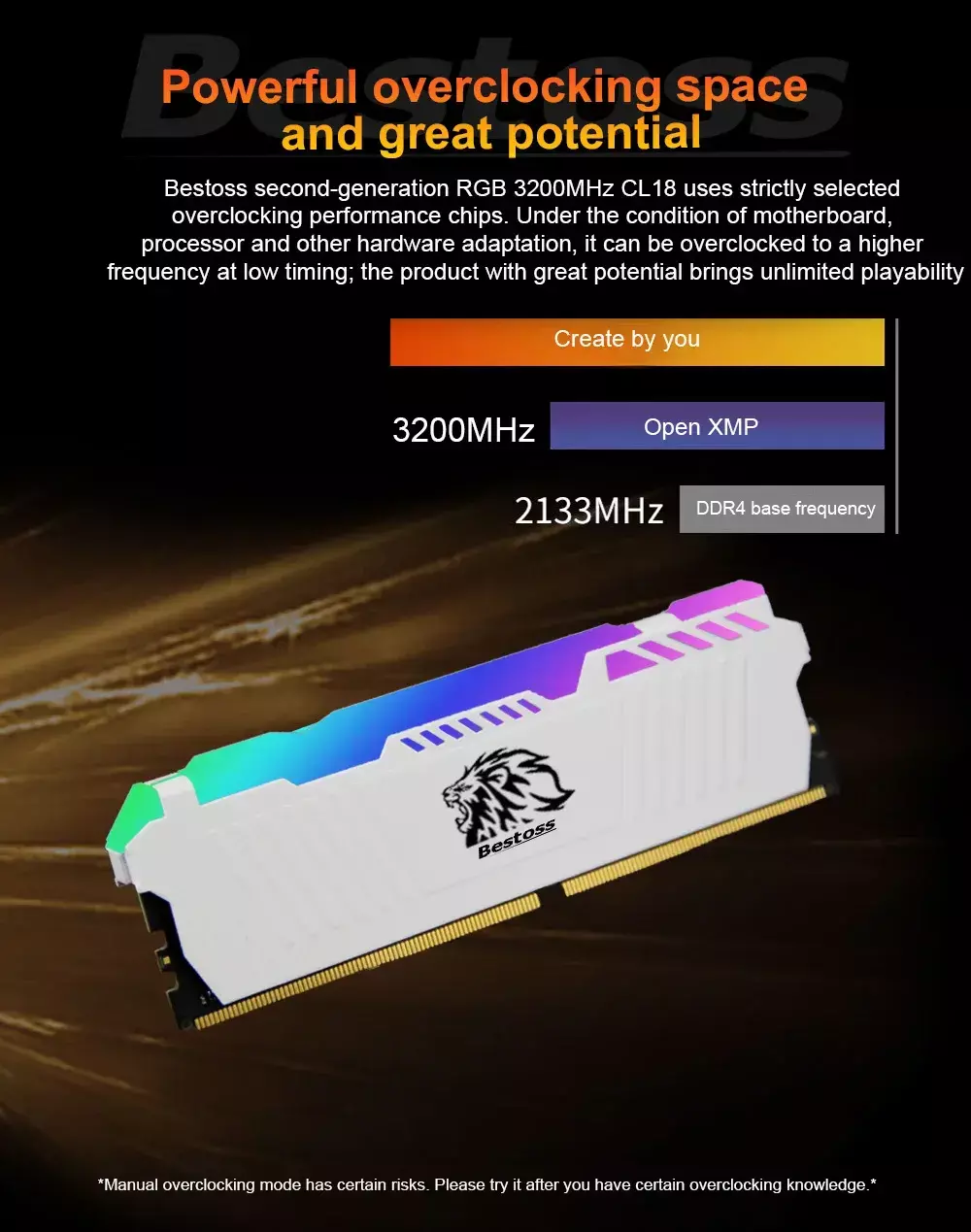 Observação: este módulo de memória RGB Bestoss requer que sua placa-mãe suporte o overclocking para atingir uma frequência de 3200 MHz. Se sua placa-mãe não suportar overclocking, a frequência será de 2.400 MHz.