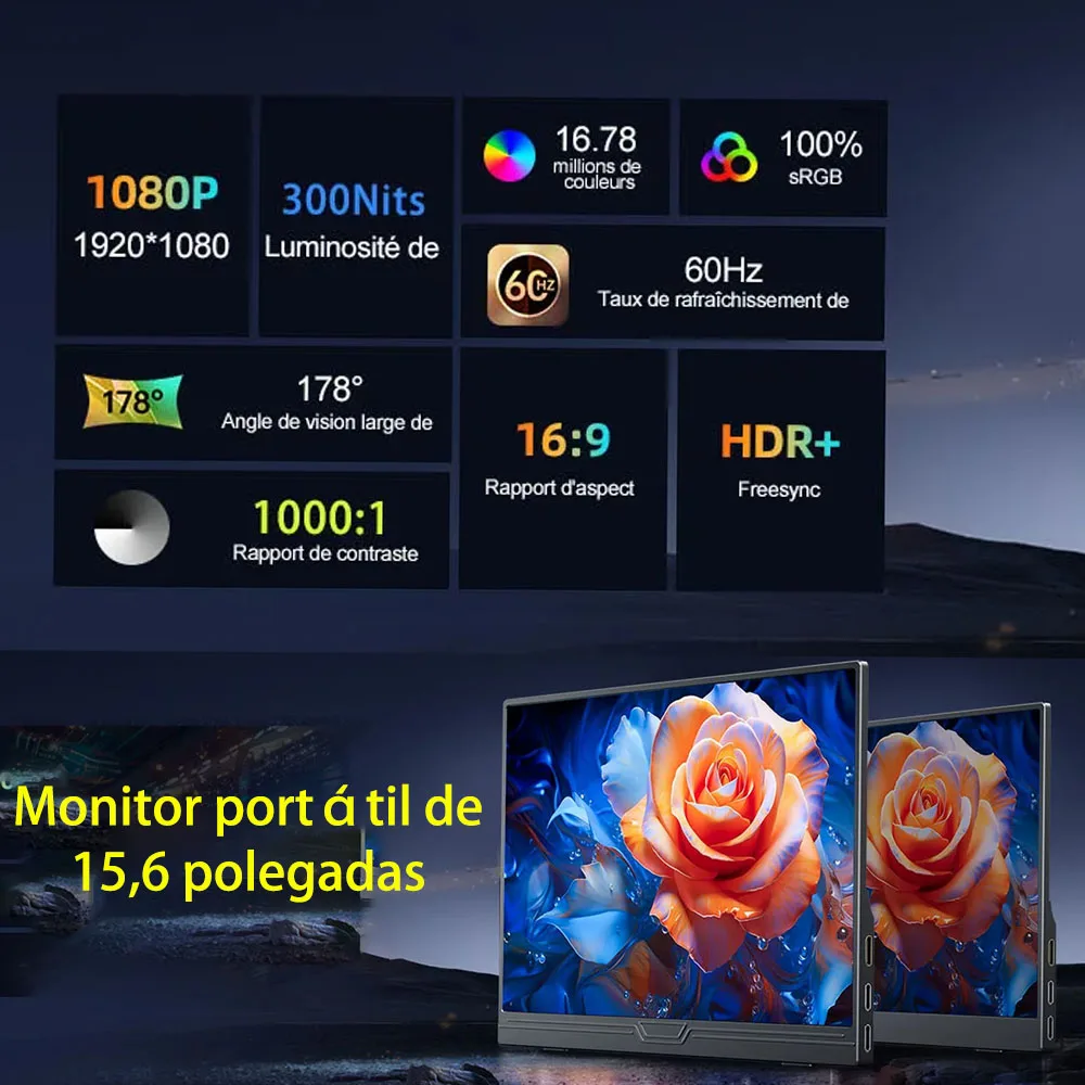 [Mergulhe na maior gama de cores de alta qualidade] O monitor portátil de 15,6" possui resolução de alta definição 1080P FHD e gama 100% sRGB traz qualidade de imagem nítida, mergulhe em cores vibrantes e detalhes nítidos