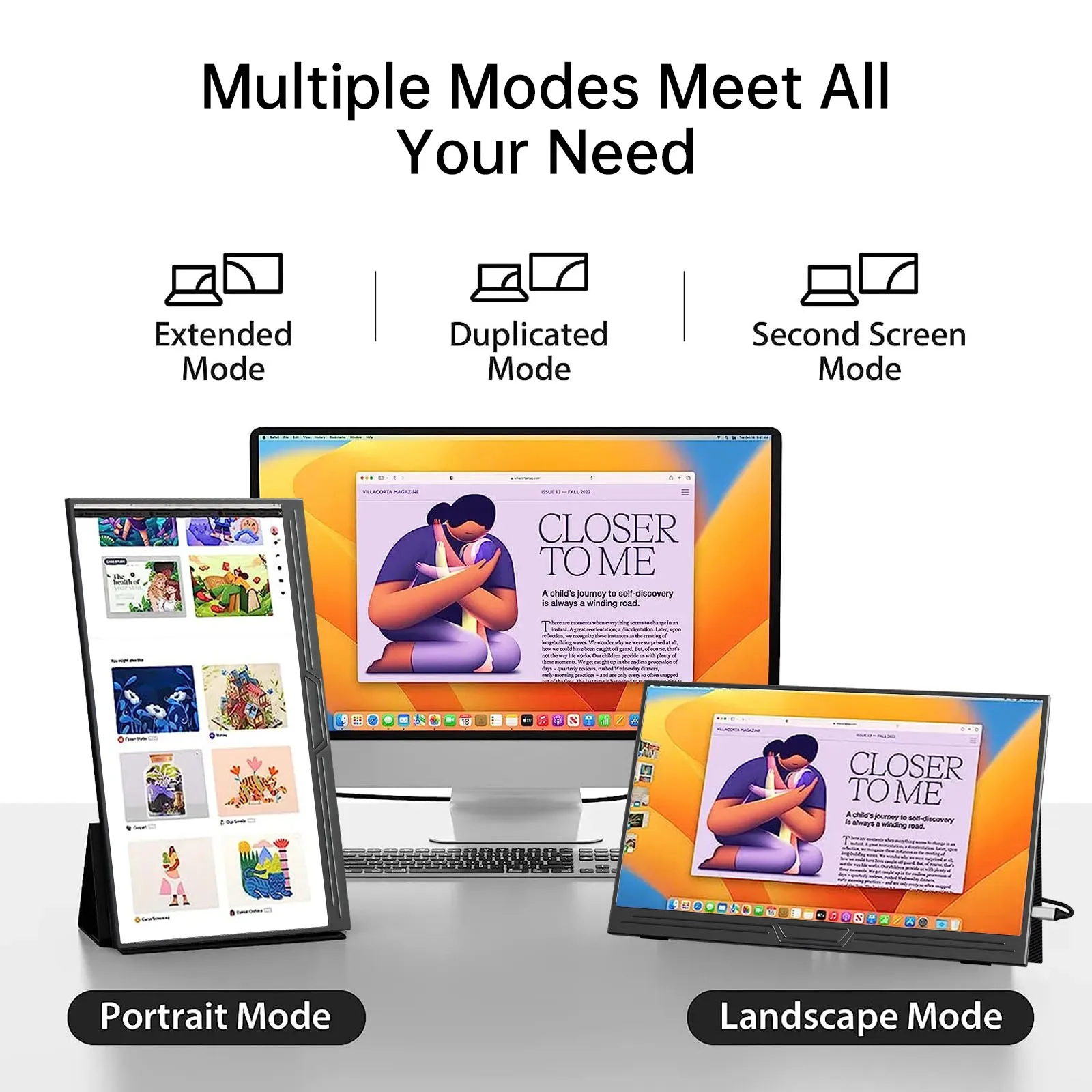 [Segundo monitor para o seu laptop] O monitor portátil pode funcionar muito bem como sua segunda tela e melhorar a eficiência do seu trabalho.Você pode trabalhar e realizar várias tarefas simultaneamente enquanto usa este monitor.Você também pode alternar a visualização da tela entre os modos horizontal e vertical para obter a perspectiva que preferir.