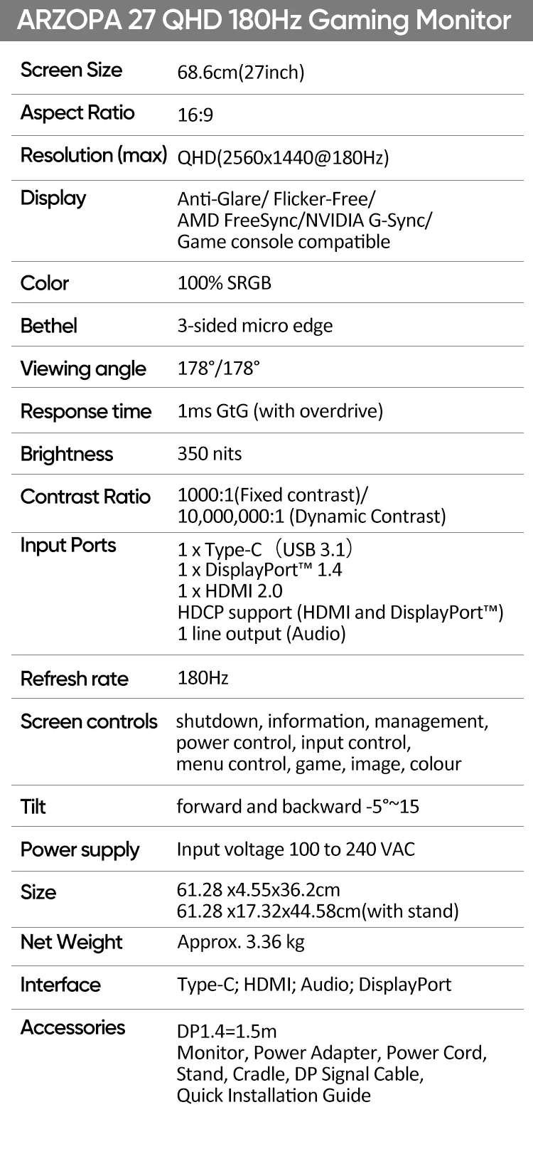 Refresh Rate: DP/Type-C supports up to 180Hz; HDMI supports up to 144Hz