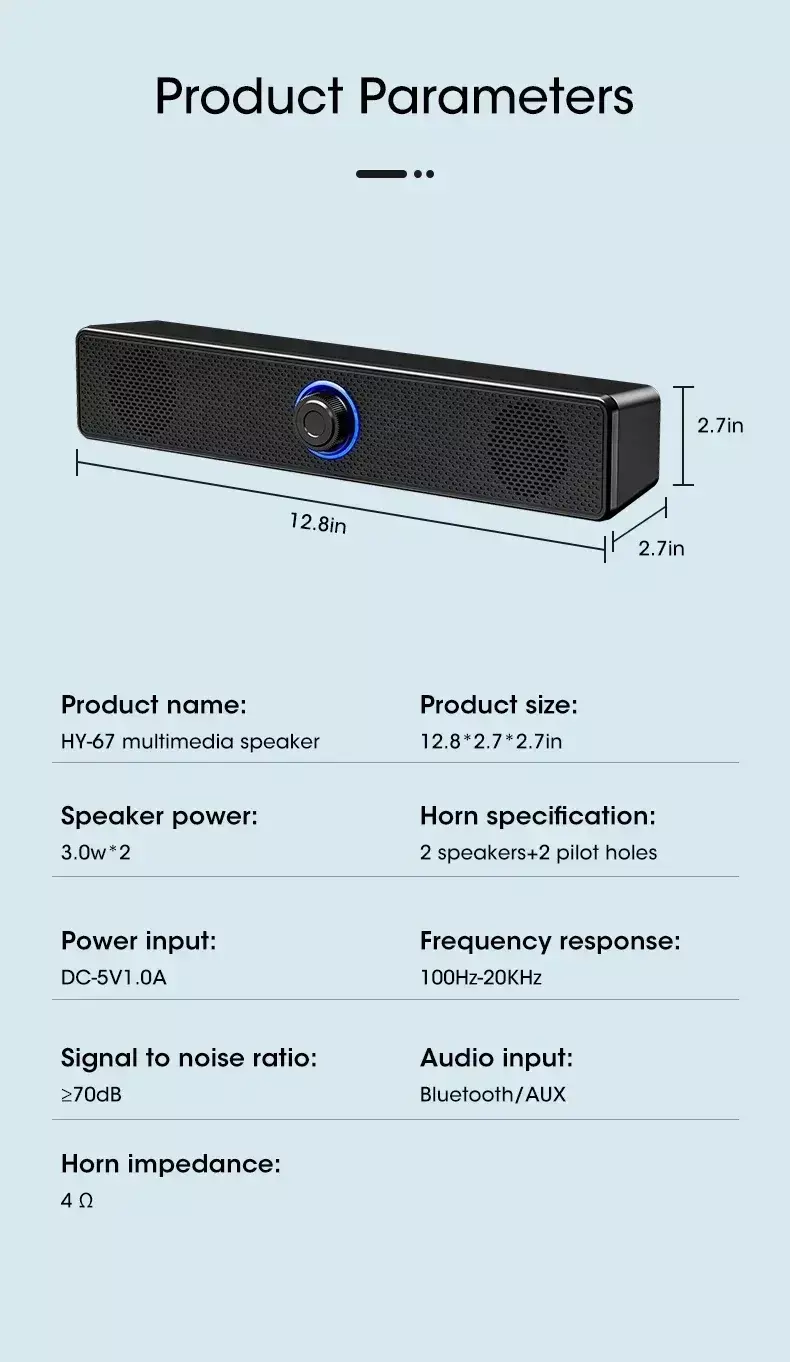 • USB Powered :This soundbar is USB powered, ensuring easy and convenient operation without the need for additional wiring or power supplies.